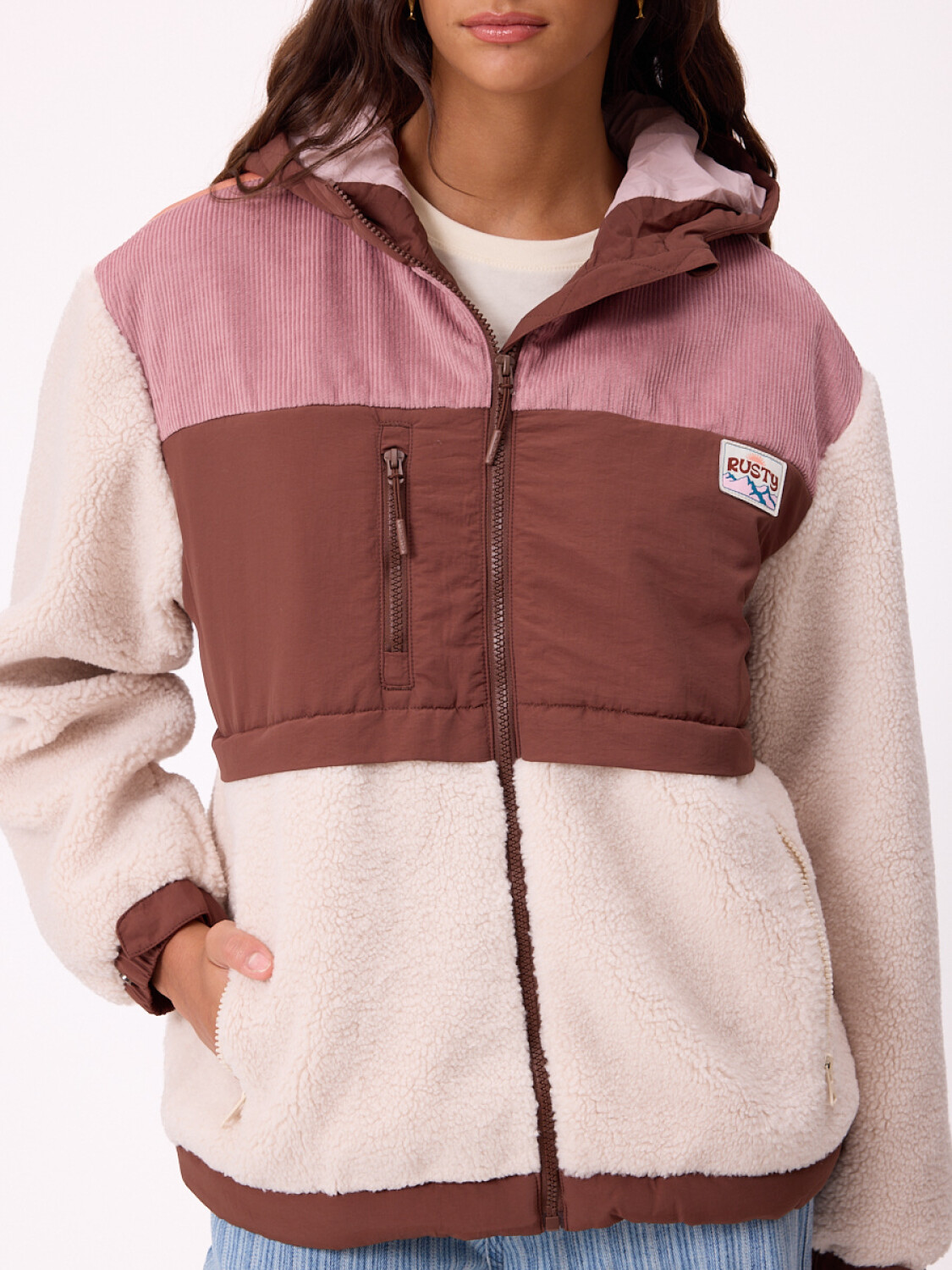 CAPUCHA DE NYLON CON CORTES EN SHERPA Y PANA
